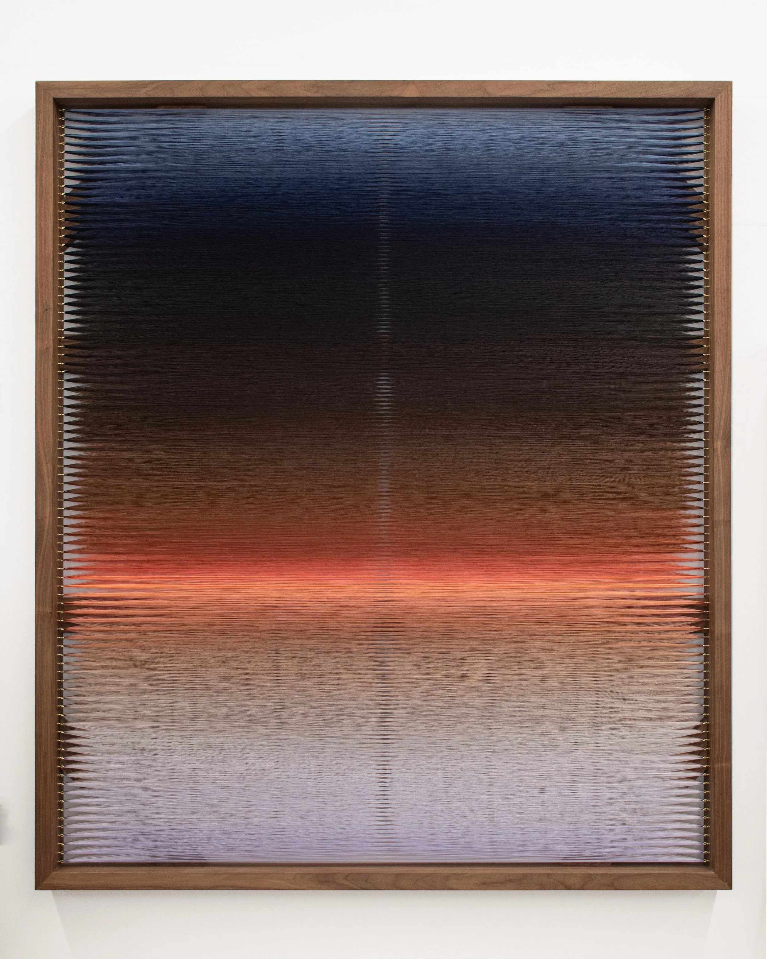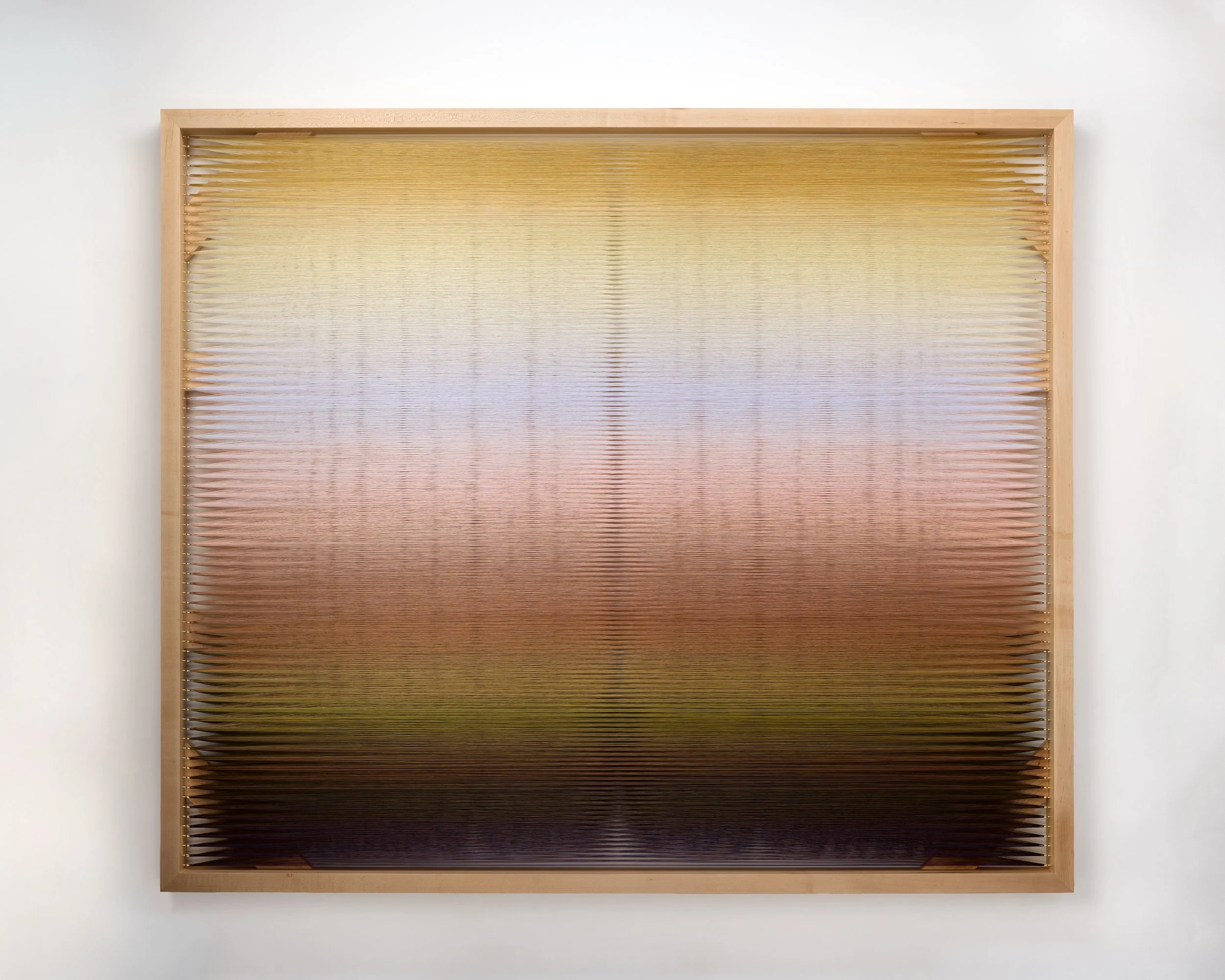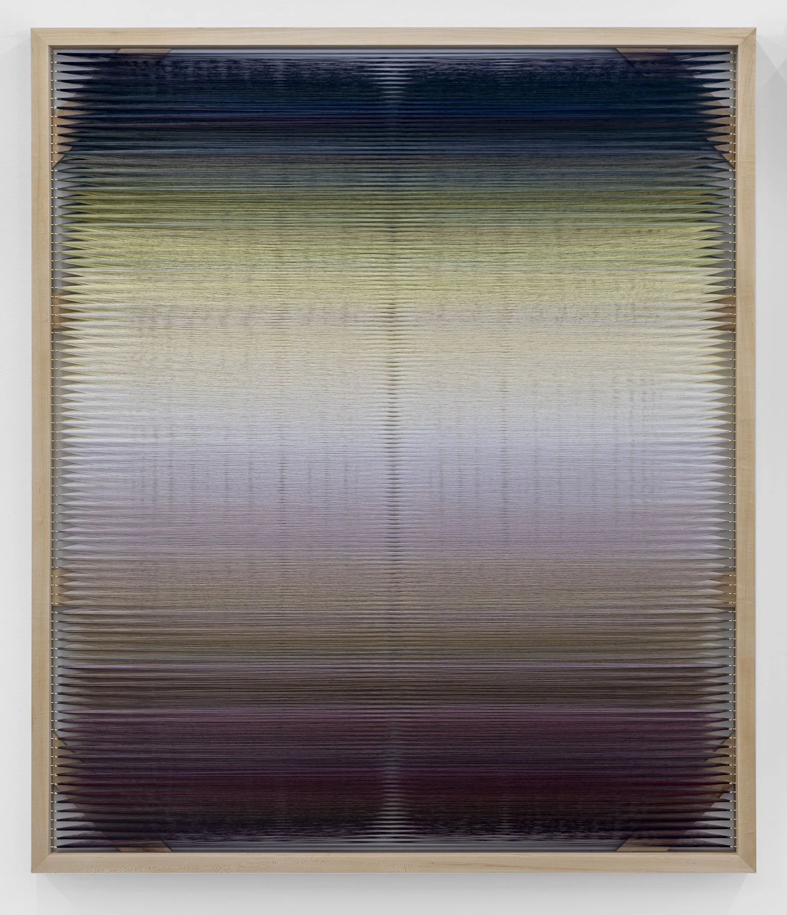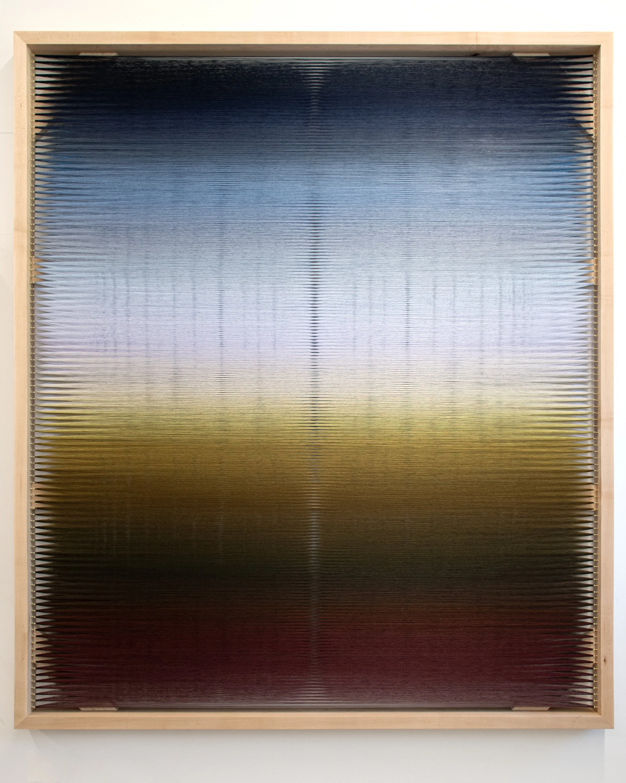 While the works are not literally woven – not a matrix of interlocking threads – the overlapping threads appear like a textile surface. Each work is strung according to a system of mathematical permutations. As I cross each thread over the center of the frame to its next hook, the center of each color band builds in saturation and intensity, and a dimensional structure and texture starts to emerge. Like the act of weaving cloth on a loom, these Woven Screens make apparent the evolution of a “one-dimensional” line of thread to a taut, two-dimensional rectangular plane, to an undulating three-dimensional woven surface. Each thread strung across the surface functions like a drawn line; together these lines form a complete object and image.