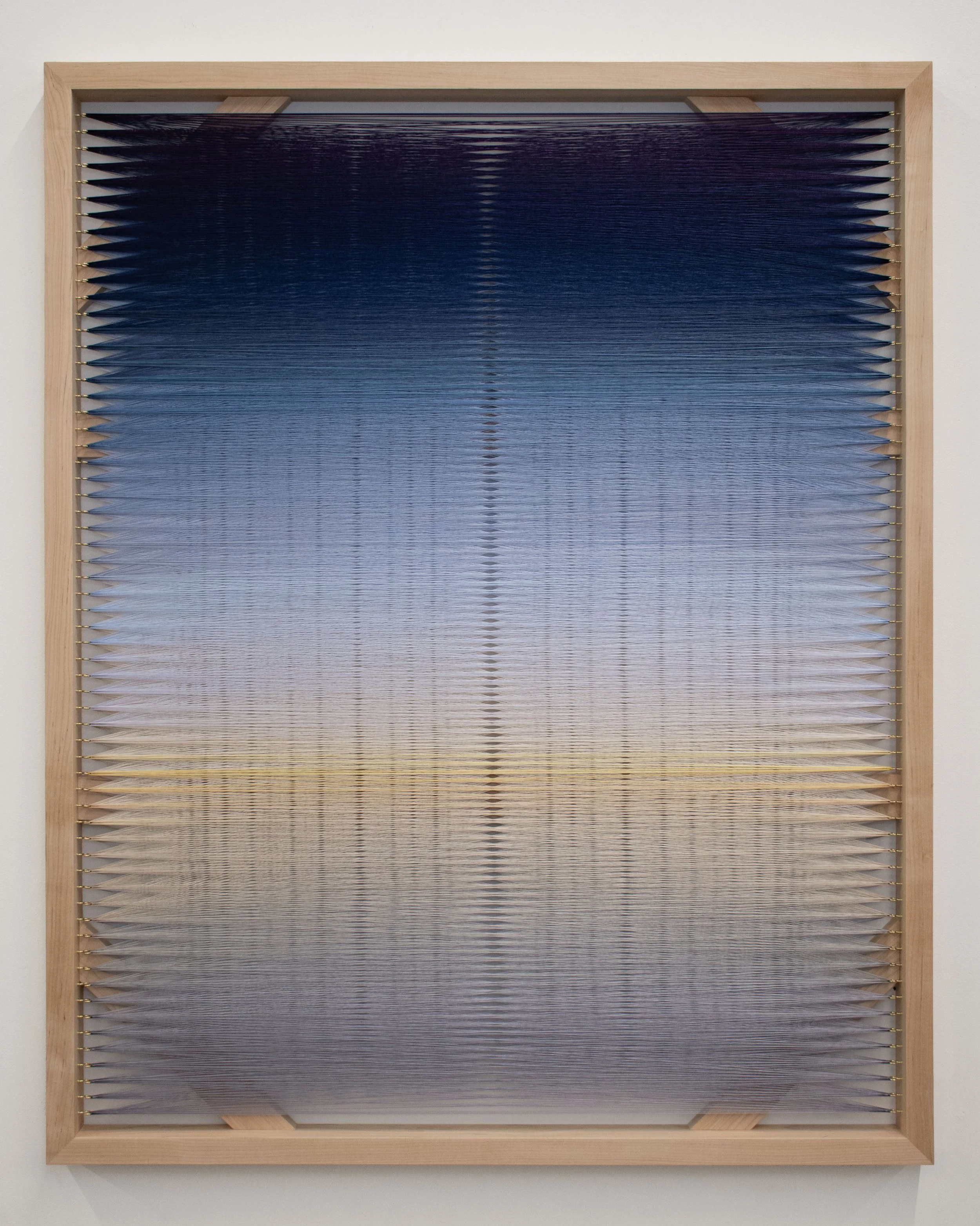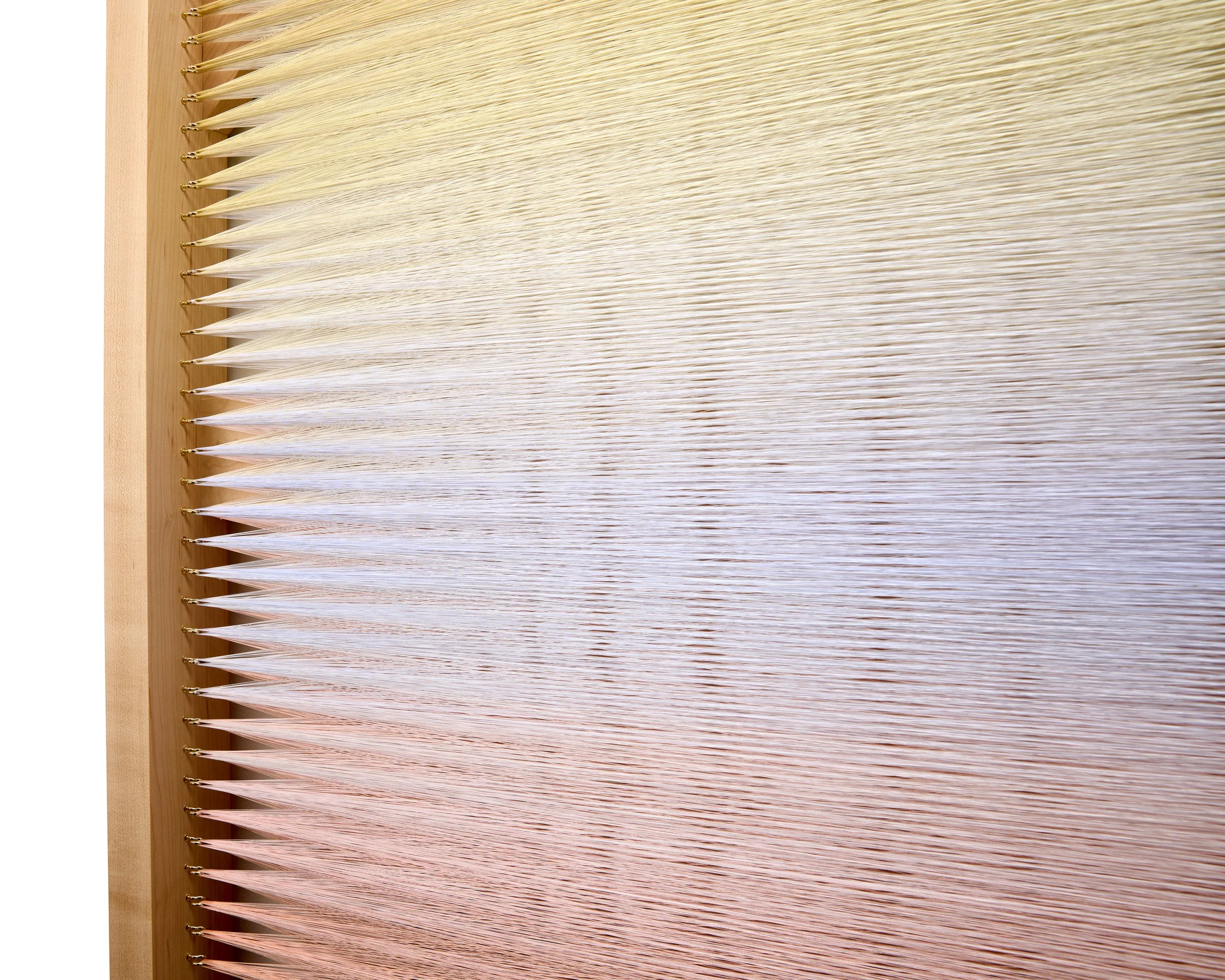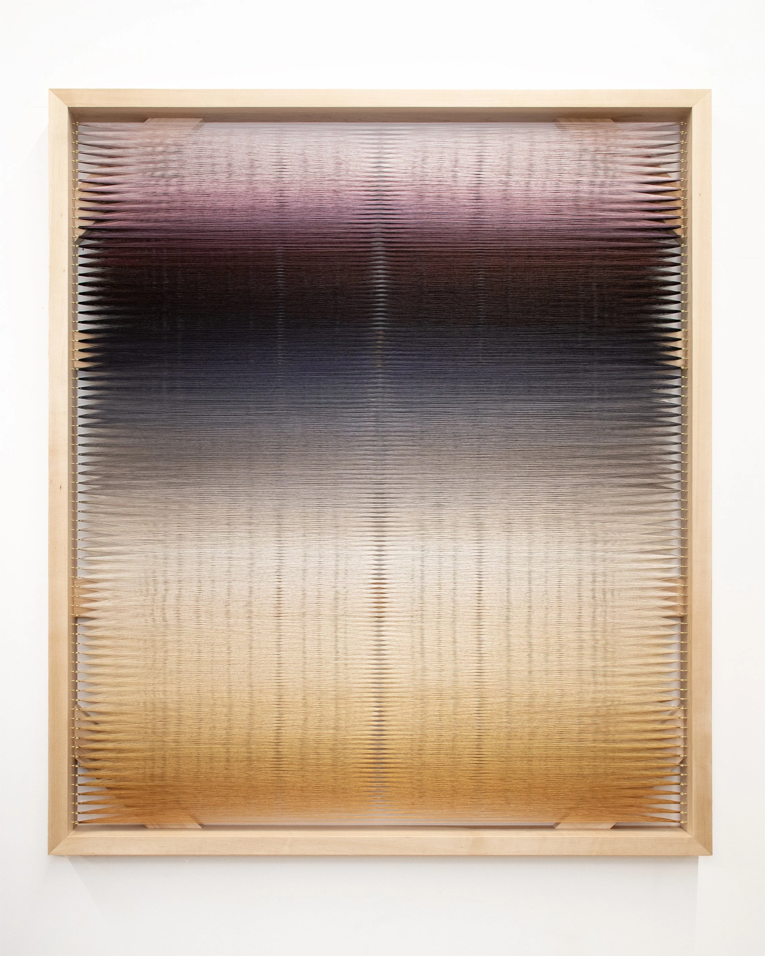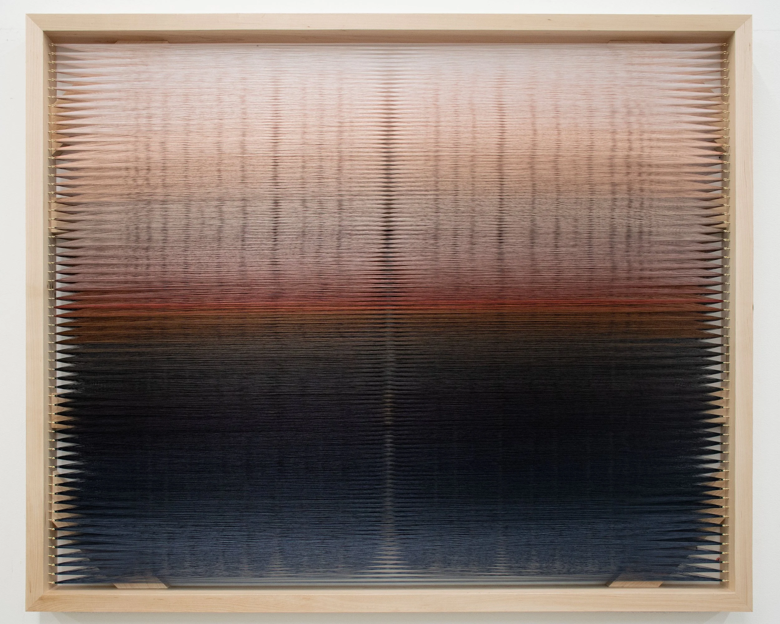 While the works are not literally woven – not a matrix of interlocking threads – the overlapping threads appear like a textile surface. Each work is strung according to a system of mathematical permutations. As I cross each thread over the center of the frame to its next hook, the center of each color band builds in saturation and intensity, and a dimensional structure and texture starts to emerge. Like the act of weaving cloth on a loom, these Woven Screens make apparent the evolution of a “one-dimensional” line of thread to a taut, two-dimensional rectangular plane, to an undulating three-dimensional woven surface. Each thread strung across the surface functions like a drawn line; together these lines form a complete object and image.