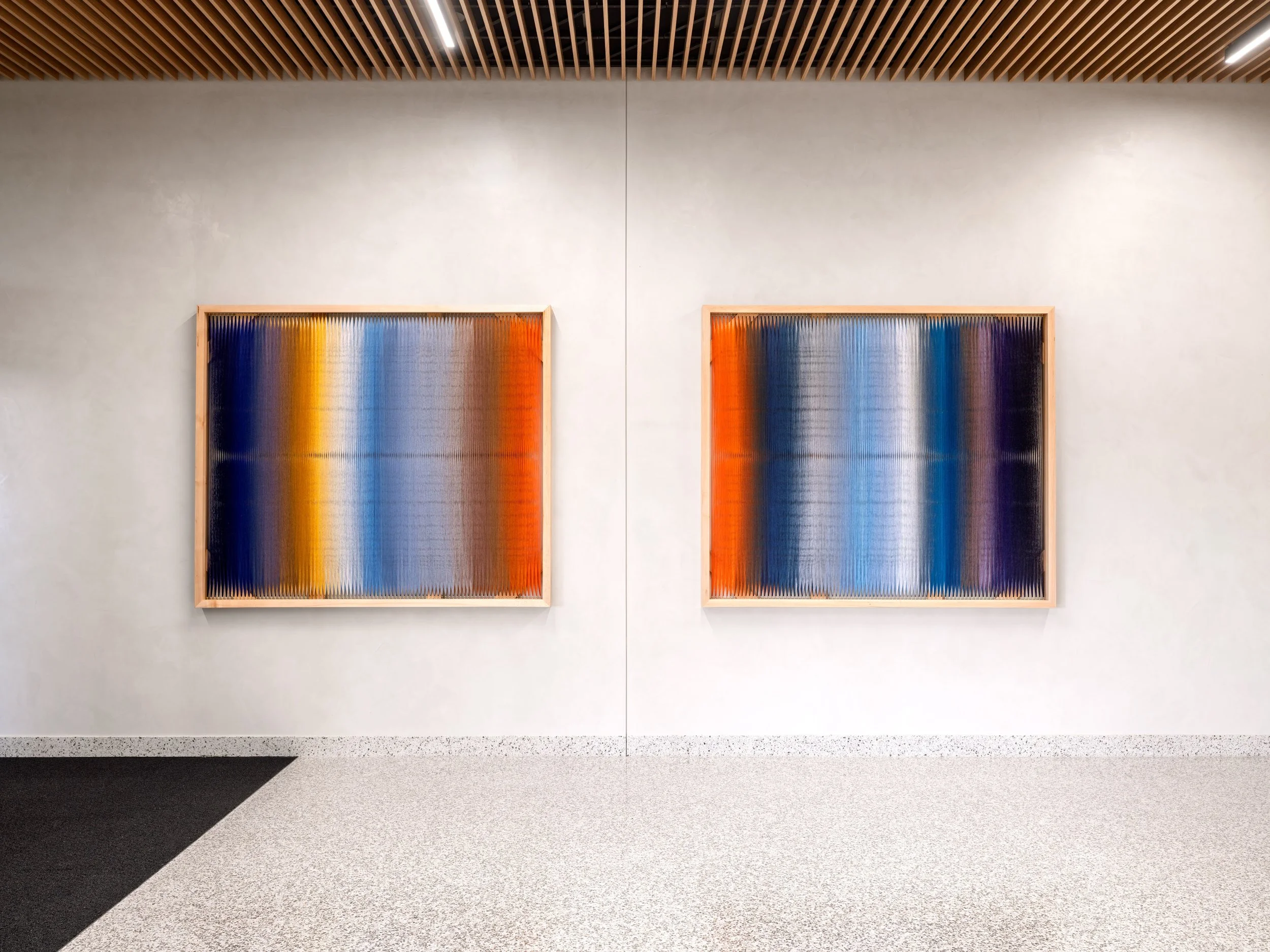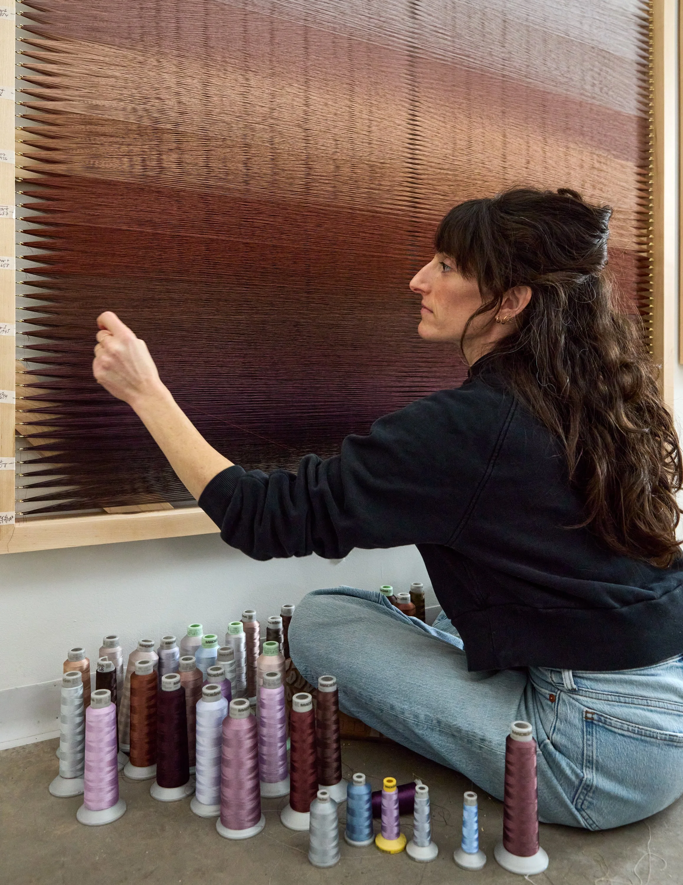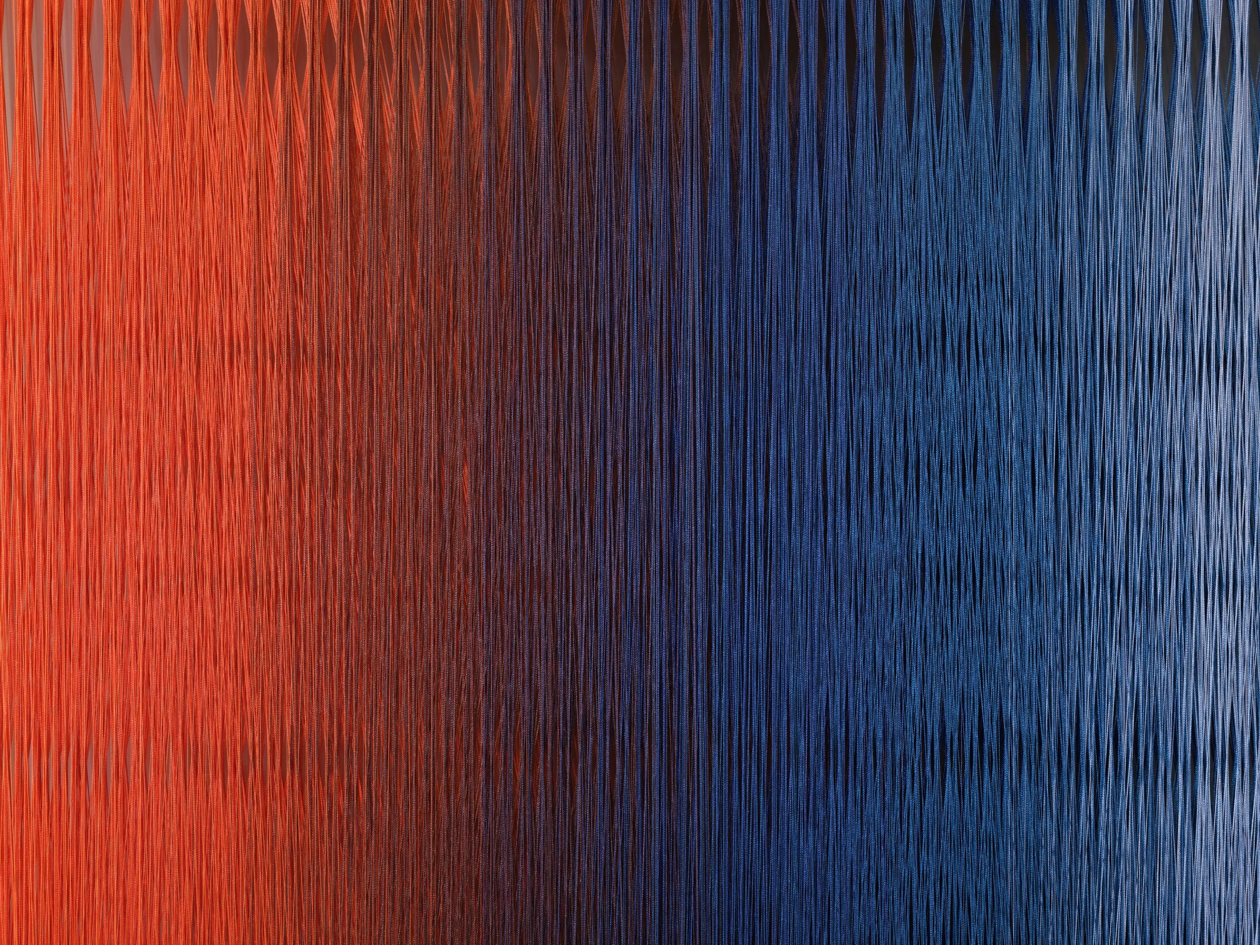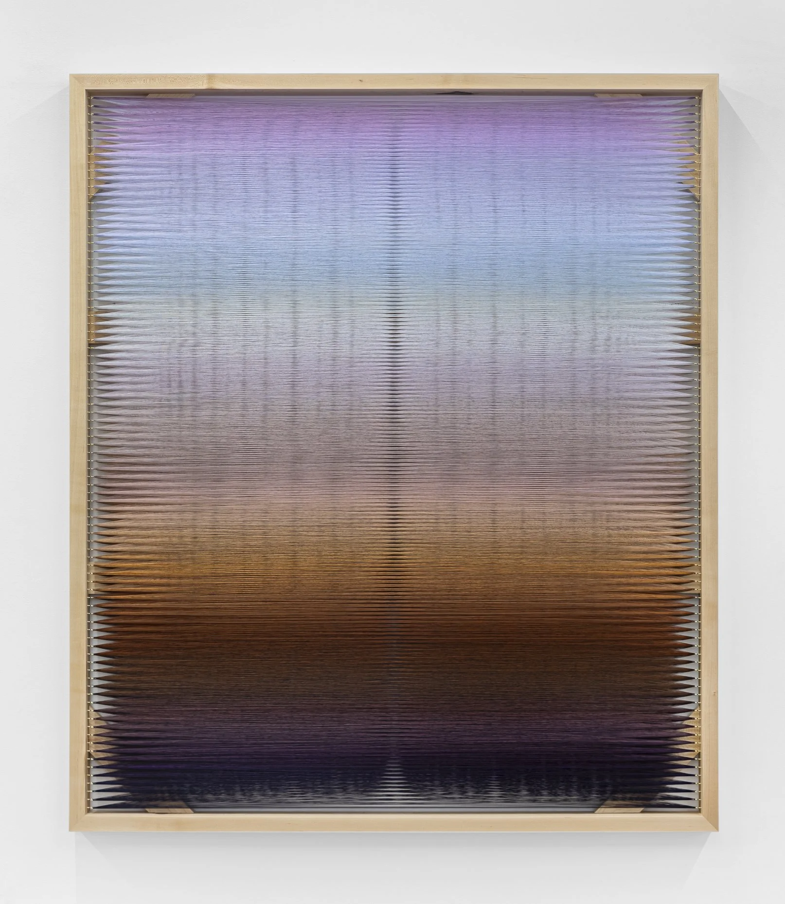 While the works are not literally woven – not a matrix of interlocking threads – the overlapping threads appear like a textile surface. Each work is strung according to a system of mathematical permutations. As I cross each thread over the center of the frame to its next hook, the center of each color band builds in saturation and intensity, and a dimensional structure and texture starts to emerge. Like the act of weaving cloth on a loom, these Woven Screens make apparent the evolution of a “one-dimensional” line of thread to a taut, two-dimensional rectangular plane, to an undulating three-dimensional woven surface. Each thread strung across the surface functions like a drawn line; together these lines form a complete object and image.